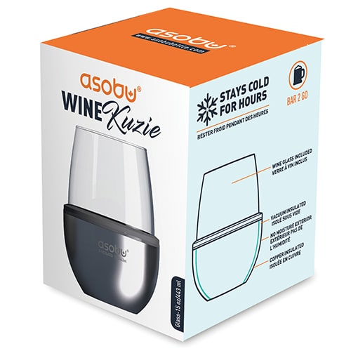 The Asobu® Insulated Wine Cooler is ideal for keeping your wine chilled and constantly at the perfect temperature . The slim double wall vacuum insulated wine Cooler comes in a 15 oz / 443 ml stemless wine glass (wine glass is included). It will keep your wine chilled, and is ideal for serving white wines, blush, rose and sparkling wines, as well as being ideal for champagne! Whether indoors or outdoors, enjoy the great taste of your favourite wine served perfectly and constantly chilled with the Asobu® Insulated Wine Cooler!