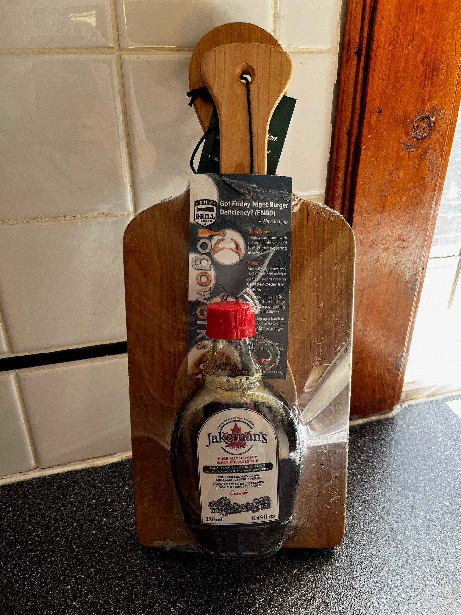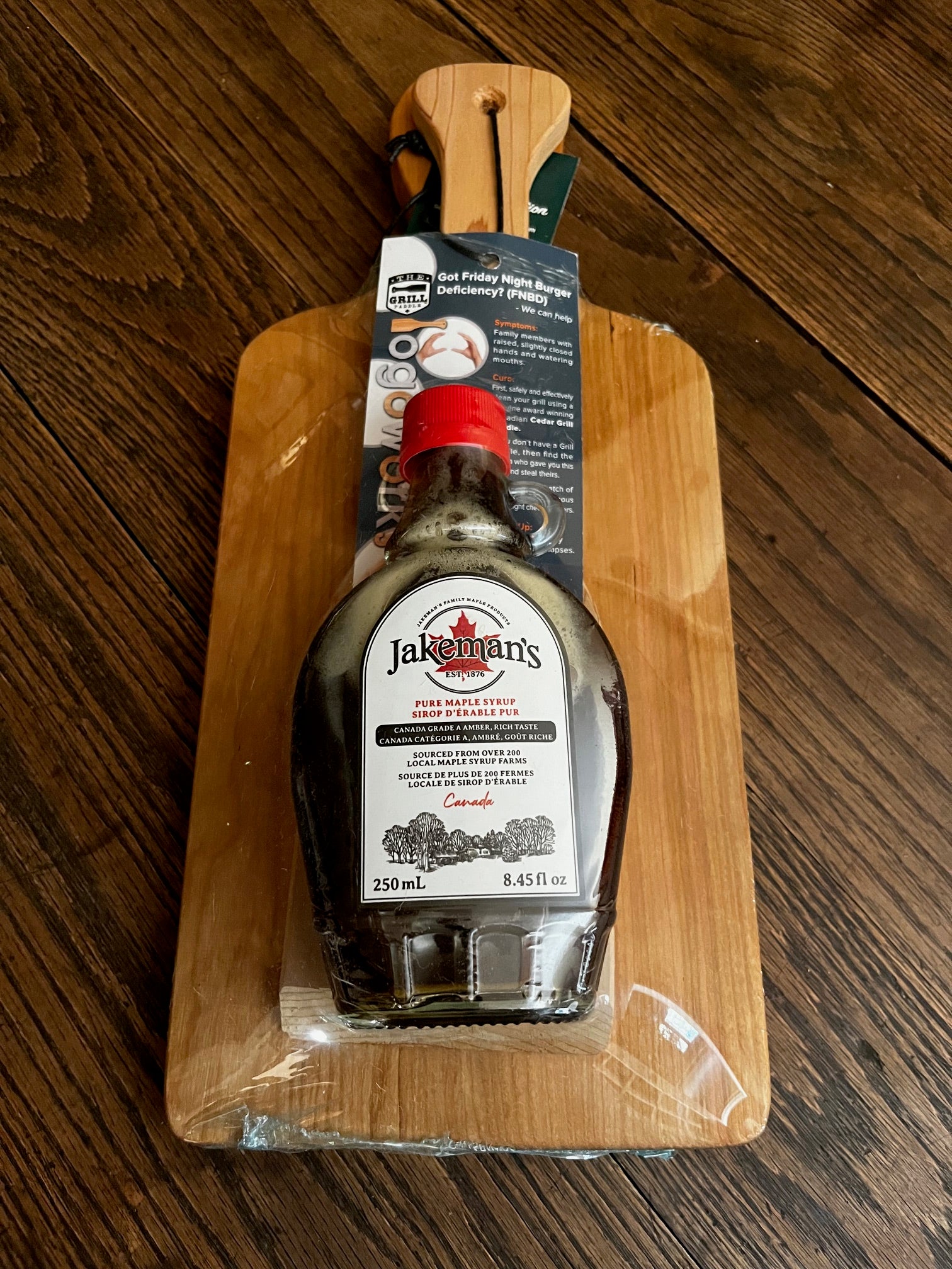 Crafted for grill masters and maple lovers alike, this Canadian-made set includes a handcrafted maple wood serving board, a cedar BBQ grill scraper and a bottle of Jakeman's Pure Maple Syrup.