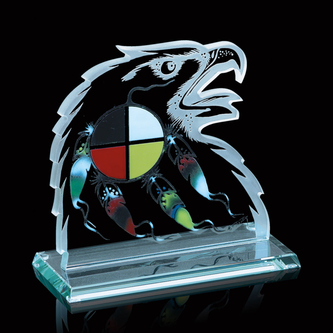 Four Colours of Man, one of the Northern Dreams series of original artwork by First Nations artist Gordon Fiddler, depicts a four-coloured circle with trailing feathers within the profile of an eagle’s head. The piece is aqua shaped 3/8” jade glass on a beveled jade base. The red, white, yellow and black colours within the circle are constant, while the hues of the multicoloured feathers vary from piece to piece.