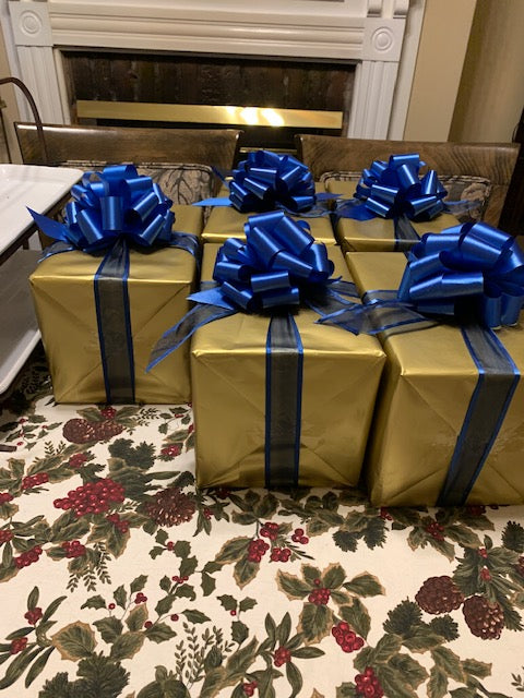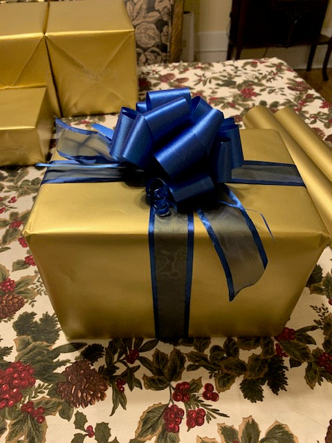 This gift wrapping service was provided for a client who requested high end tech items for a special group on her team. Meticulously wrapped in matte gold wrapping paper with a royal blue organza ribbon and bow tied. Tech items were provided by Red Scarf.