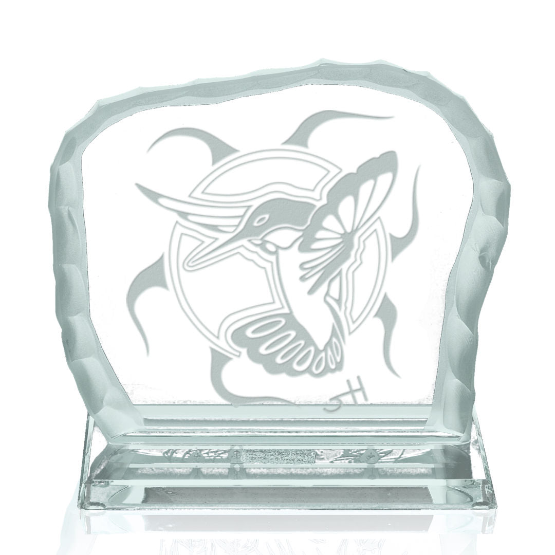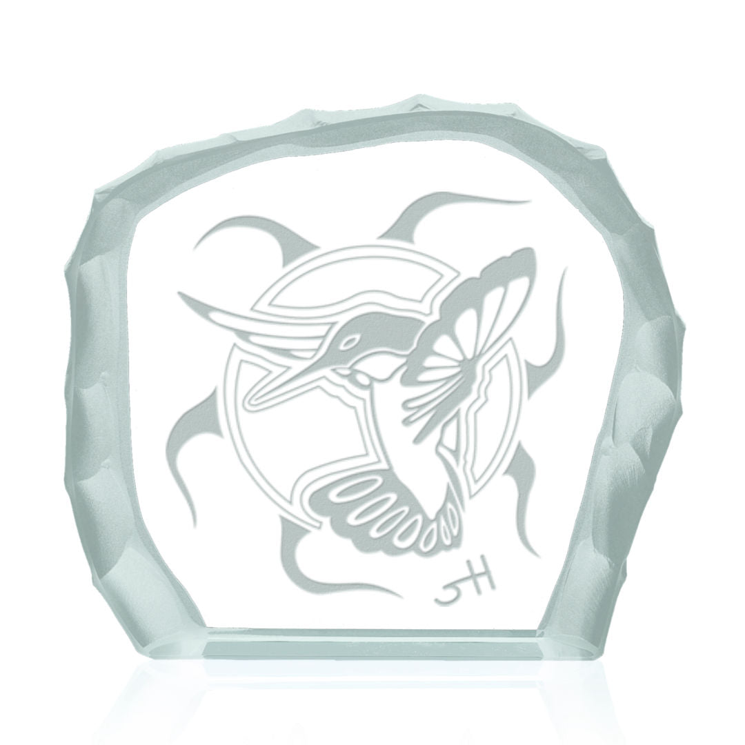 Agility is one piece in the Spiritual Essence series of original artwork by artist Steven Hearns. His bold geometric abstractions of wildlife are reflections of aboriginal traditions and values. This ¾” jade glass piece on a 3/8” beveled jade base is approximately 6½” wide with back edges chipped and frosted. It is accompanied by a romance card containing notes on the artist and thematic comments on the artwork. Shown is the smaller, 3½” wide, freestanding version. Contact Us for the larger version with a base.