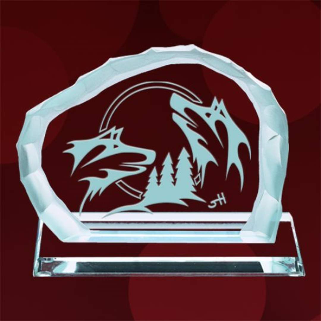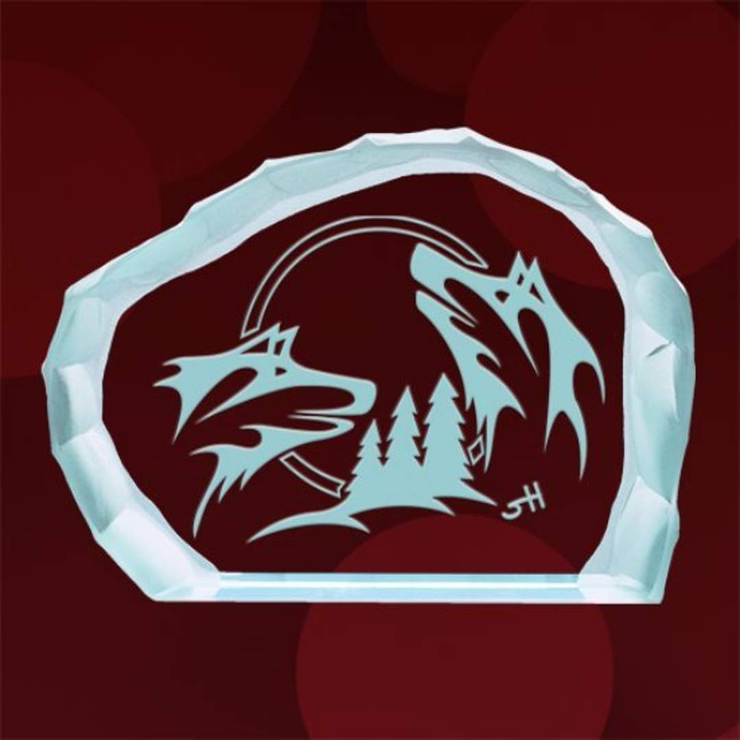 Brother Wolf is one piece in the Spiritual Essence series of original artwork by artist Steven Hearns. His bold geometric abstractions of wildlife are reflections of aboriginal traditions and values. This freestanding ¾” jade glass piece is approximately 3½” wide with back edges chipped and frosted. It is accompanied by a romance card containing notes on the artist and thematic comments on the artwork. Also available in a larger version, approximately 6½” wide, on a 3/8” beveled jade base. Contact Us for the larger version with a base.