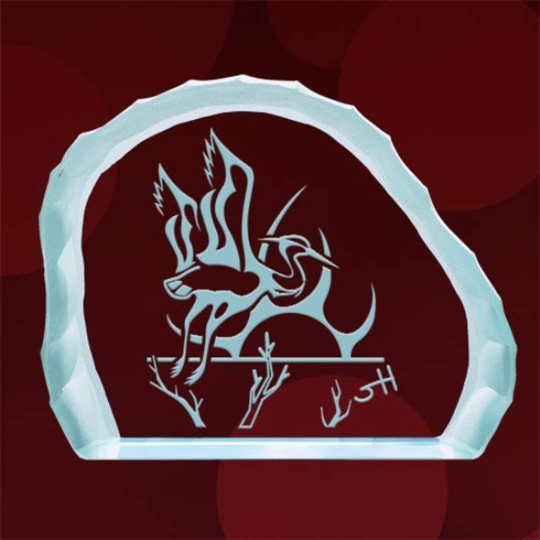 Time Has Come is one piece in the Spiritual Essence series of original artwork by artist Steven Hearns. His bold geometric abstractions of wildlife are reflections of aboriginal traditions and values. Shown is the ¾” jade glass piece on a 3/8” beveled jade base is approximately 6½” wide with back edges chipped and frosted. It is accompanied by a romance card containing notes on the artist and thematic comments on the artwork. Contact Us for the freestanding version, dimensions: 3.5" x 3.5"