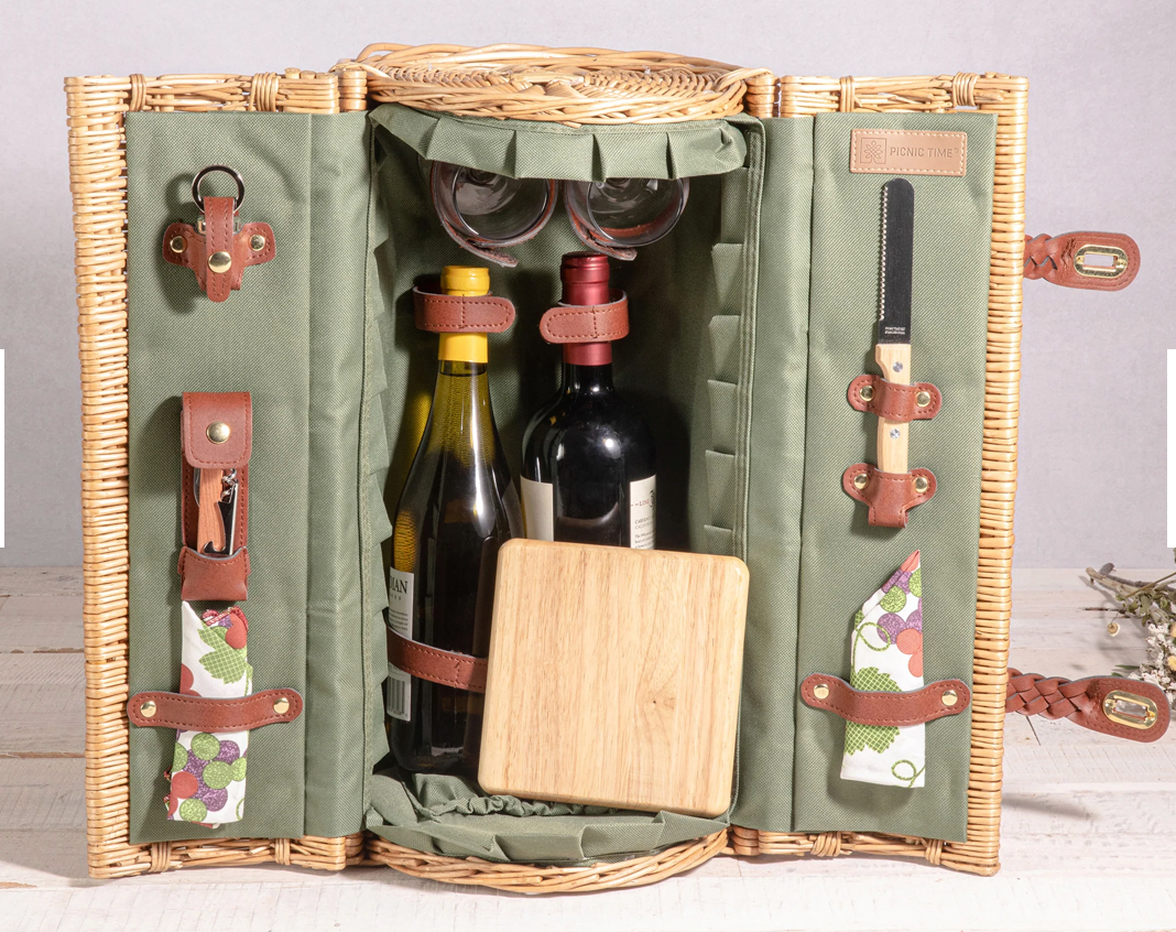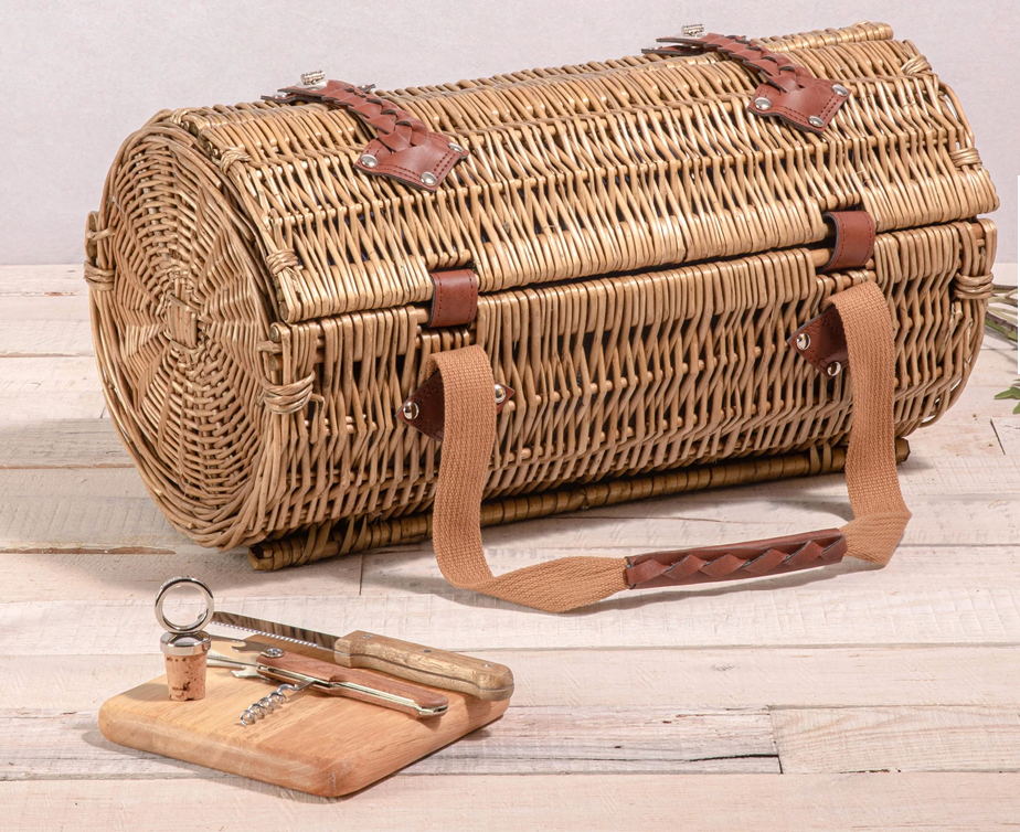 1 Wine Basket, (Willow, 18” X 10” X 10”) | 2 Wine Glasses, (Glass, 7 oz.) | 1 Bottle Stopper, (Nickel-Plated Steel, Cork, 1" X 6" X 2.5") | 1 Waiter-Style Corkscrew, (Stainless Steel, 4") | 1 Cutting Board (Oak, 6" X 6") | 1 Cheese Knife, (Stainless Steel, Rosewood, 8" X .59" ) | 2 Napkins, (100% Cotton, 14" X 14")
